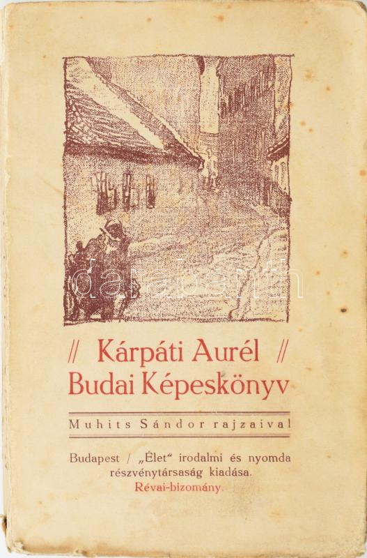 Kárpát Aurél: Budai képeskönyv. Bp., [1914.], "Élet". Lapszámozáson belül Muhits Sándor egészoldalas grafikáival gazdagon illusztrált. Kiadói papírkötés, foltos borítóval, a hátsó borító szakadt, gyűrött, a gerincen sérülésnyommal.