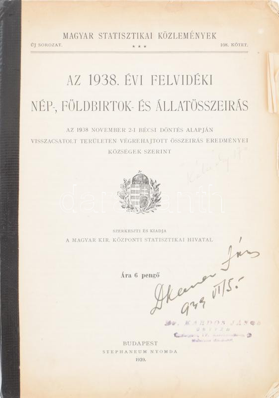 Magyar Statisztikai Közlemények: Az 1938. évi felvidéki nép-, földbirtok- és állatösszeírás. Az 1938 november 2-i bécsi döntés alapján visszacsatolt területen végrehajtott összeírás eredményei községek szerint. Szerkeszti és kiadja a M. Kir. Központi Statisztikai Hivatal. Magyar Statisztikai Közlemények Új sorozat 108. kötet. Bp., 1939., Stephaneum, VIII+51+277+3 p. Papírkötés, amatőr módon javított gerinccel, hiányzó térképpel, a címlapon szakadásokkal, névbejegyzésekkel és Kardos János ügyvéd névbélyegzésével. Kardos János (1894-1959) ügyvéd. A második világháború után - amíg tehette - több kiemelt koncepciós perben is közreműködött védőként. (Szomathelyi Ferenc, Dálnoki Veress Lajos, András Sándor, Esterházy Pál herceg, Ordass Lajos, Rácz Sándor, Tóth Ilona ..stb.)