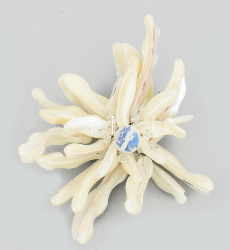 Leírás: Gyöngyház elemekből épített bross, d: cca 10 cm