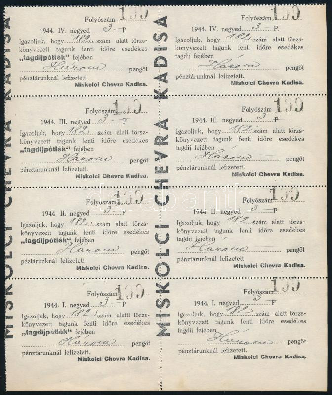 Leírás: 1944 A Miskolci Chevra Kadisa nyugta íve tagdíj befizetésről 8 db sorszámozott