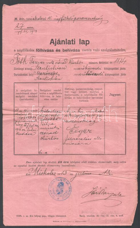 1913 Miskolc, Ajánlati lap a népfölkelés fölhívása és behívása esetén való szolgálattételre Tóth Ferenc volt század kürtös számára, vitéz Sáfrány Géza altábornagy aláírásával és M. Kir. Miskolci 10. Népfölkelő Parancsnokság pecsétjével 21x34 cm