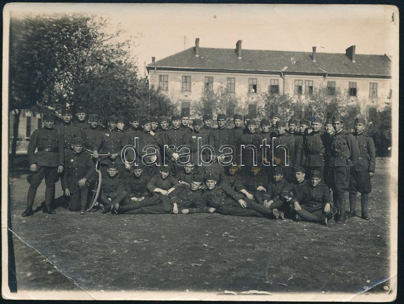 Leírás: 1929 Miskolc, katonák csoportképe a Huszár Ferenc József laktanya előtt, fotó 12x9 cm