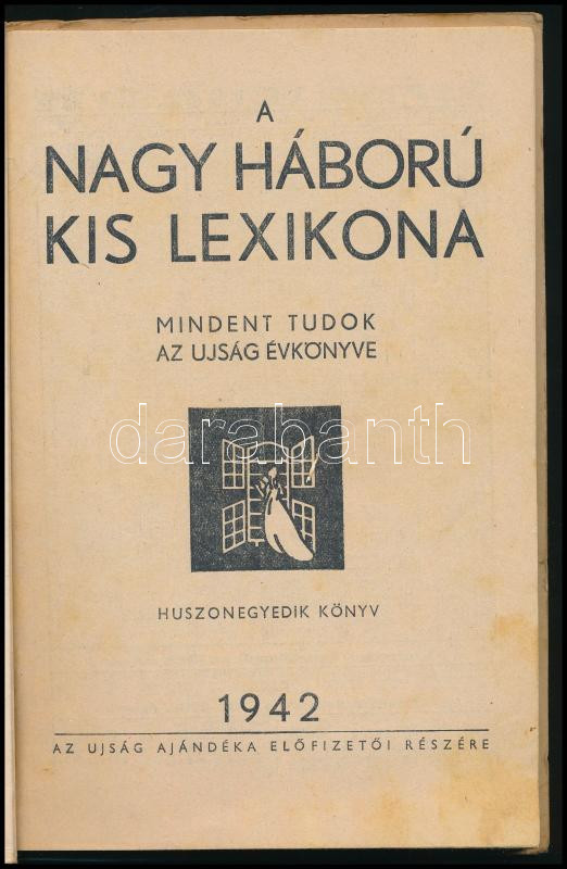 1942 A nagy háború kis lexikona, az Újság mindent tudok évkönyve, 159p https://www.darabanth.com/hu/472-Gyorsarveres/472.0/Mutargy-papirregiseg-egyeb/Militaria~500008/1942-A-nagy-haboru-kis-lexikona-az-Ujsag-mindent-tudok-evkonyve-159p~II3166813