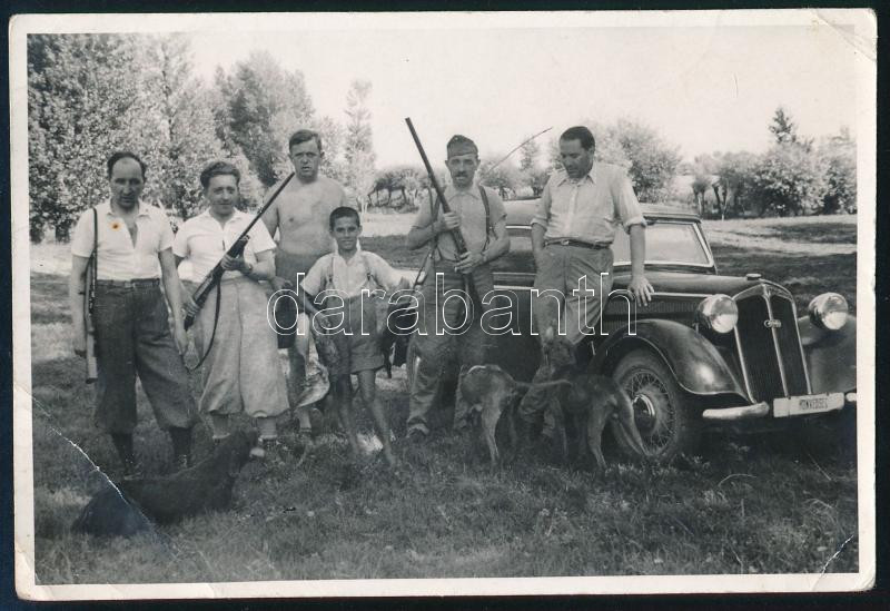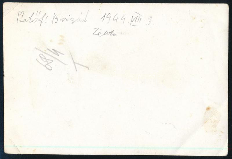 1944.VIII.3. Zenta (Vajdaság), Petőfi Brigád, fegyveresek "Honvédség" rendszámtáblájú automobillal, a hátoldalon feliratozott fotó, kisebb törésnyomokkal, 12,5x8,5 cm