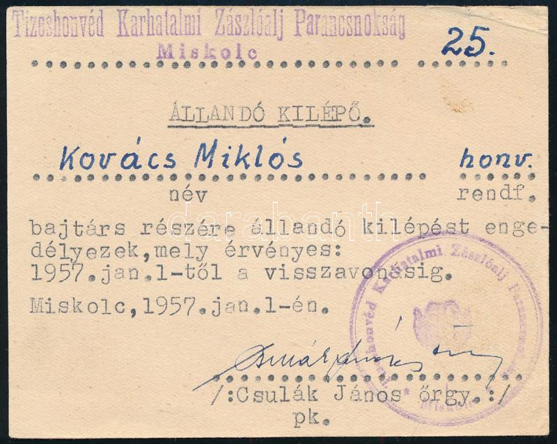 1957 Miskolc, Tizeshonvéd Karhatalmai Zászlóalj Parancsnokság Állandó Kilépője Kovács Miklós honv. bajtárs részére, Csulák János orgy. pk. aláírásával 10,2x8,1 cm