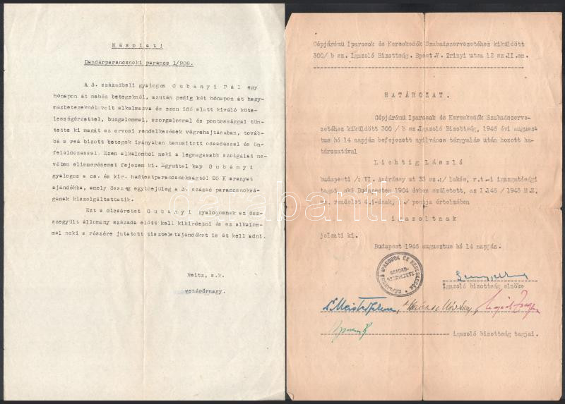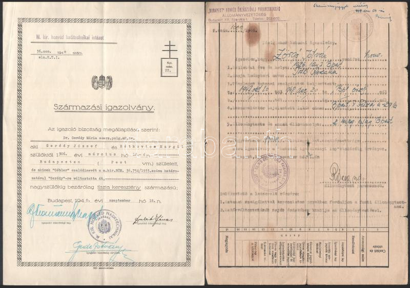 Leírás: 7 db katonai okmány, leszerelési jegy, szabadságolási igazolvány, származási igazolvány, dandárparancsnoki parancs, igazoló határozat