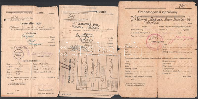 7 db katonai okmány, leszerelési jegy, szabadságolási igazolvány, szár... https://www.darabanth.com/hu/472-Gyorsarveres/472.0/Mutargy-papirregiseg-egyeb/Militaria~500008/7-db-katonai-okmany-leszerelesi-jegy-szabadsagolasi-igazolvany-szarmazasi-igazolvany-dan~II3166857