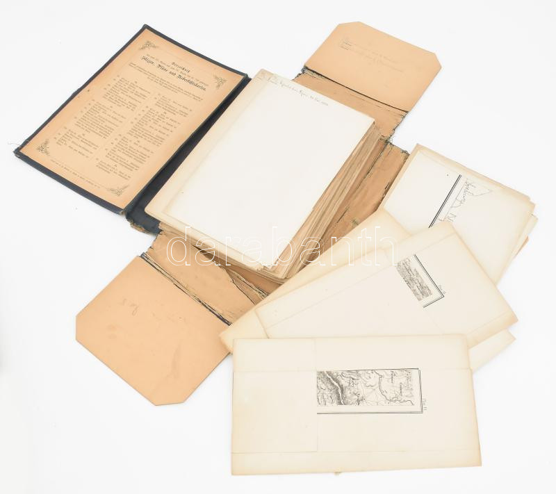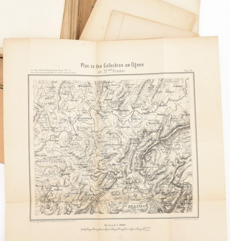 Der deutsch-französisch Krieg 1870-1871 redigirt vom Generalstabe. Karten III-IV. Berlin, Mittler u. Sohn. F., benne 28+1 térképpel, (rajtuk: ceruzás bejegyzésekkel, számozásokkal: 21/1, 22/1, 27/2, 30/1, 34/4, 35/5, 36/6, 38/3, 44/2, 44/3, 51/4, 52/7a, 52/7b, 53/11, 54/8, 55/9, 58/7c, 58/7d, 58/7c, 58/7e, 58/7f, 59/12, 60/12, 61/10, 62/2, 63/3, 63/4, 65/6,+1.) Kiadói aranyozott egészvászon-tokban, sérült tokkal, az egyik tok hiányos, a térképeken ceruzás számozásokkal, bejegyzésekkel, de ez alapján nem teljes, de vannak benne más kötetből származó térképek is. Átnézésre szorul.