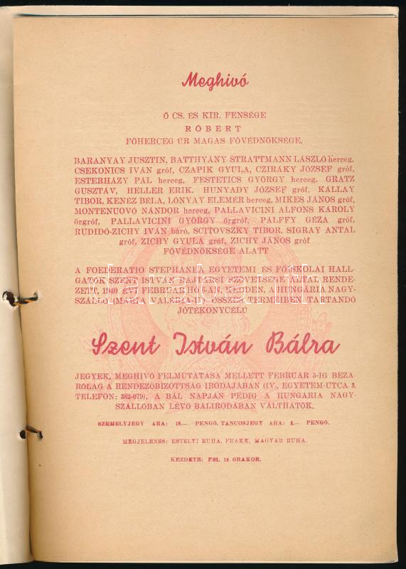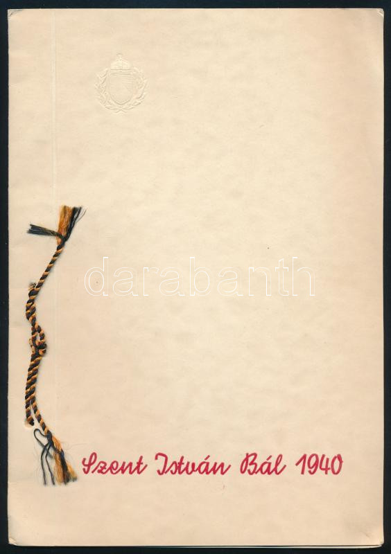 1940 Szent István bál meghívója és programja, 8 p, dombornyomott papír... https://www.darabanth.com/hu/472-Gyorsarveres/472.0/Mutargy-papirregiseg-egyeb/Nyomtatvanyok~500013/1940-Szent-Istvan-bal-meghivoja-es-programja-8-p-dombornyomott-papirboritoval~II3140895