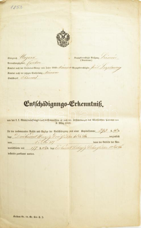 Leírás: 1853 Kártalanítási igazolás szinevéri birtoka után Szaplonczay Pál részére
