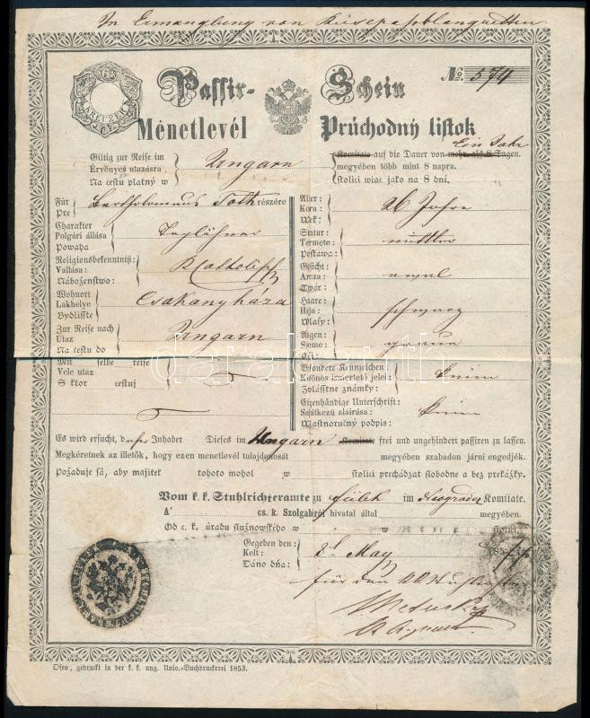 1857 Passirschein Menetlevél, útlevél Füleken kiállítva / Passport https://www.darabanth.com/hu/472-Gyorsarveres/472.0/Mutargy-papirregiseg-egyeb/Okmanyok~1000021/1857-Passirschein-Menetlevel-utlevel-Fuleken-kiallitva-Passport~II3200459