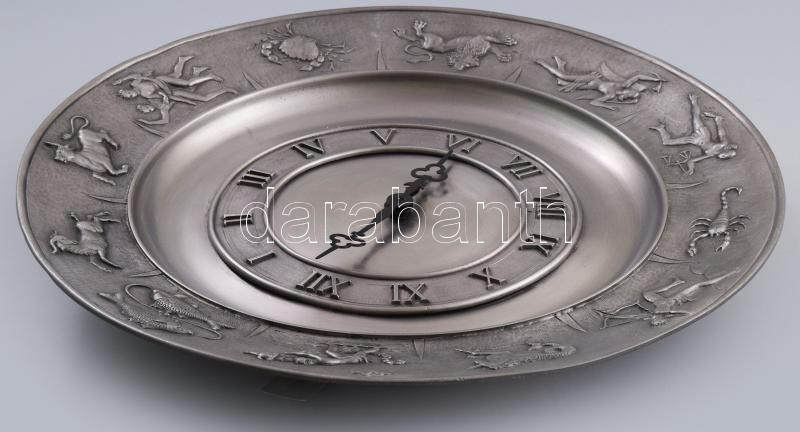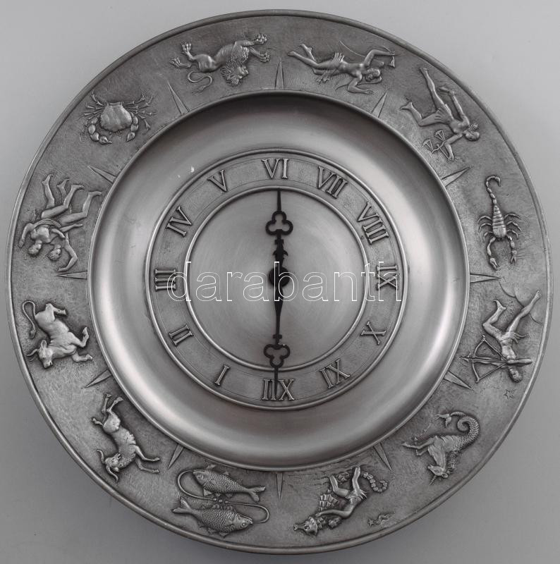 Leírás: Nagy méretű ón falióra, zodiákus plasztikus díszítésekkel d: 42 cm, Kvarc szerkezet javításra szorul