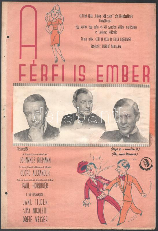 cca 1940 A férfi is ember, Cziffra Géza "Három kék szem" c. bohózatának filmváltozata, filmplakát (v. terv?), kollázs, papír, lapszéli apró szakadásokkal, lap bal szélén lyukasztással, 33,5x23 cm,