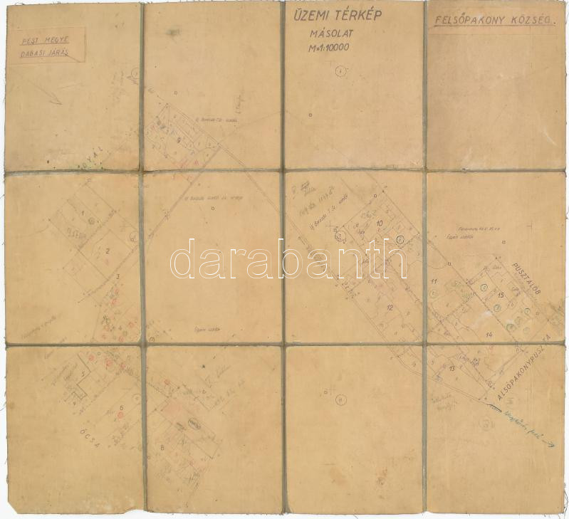 Leírás: Felsőpakony (Pest megye) üzemi térkép másolat, 1 : 10.000, vászonra kasírozva, kissé viseltes állapotban, 54x48,5 cm