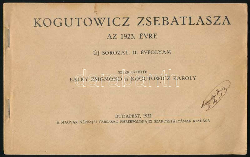 Kogutowicz zsebatlasza az 1923. évre. Új sorozat, II. évf. Szerk.: Bátky Zsigmond és Kogutowicz Károly. Bp., 1922, Magyar Néprajzi Társaság Emberföldrajzi Szakosztálya, 2+XII+4-116 p. Haránt-alakú papírkötés, borító hiánnyal, foltos címlappal, az Európa-térkép hiányzik.