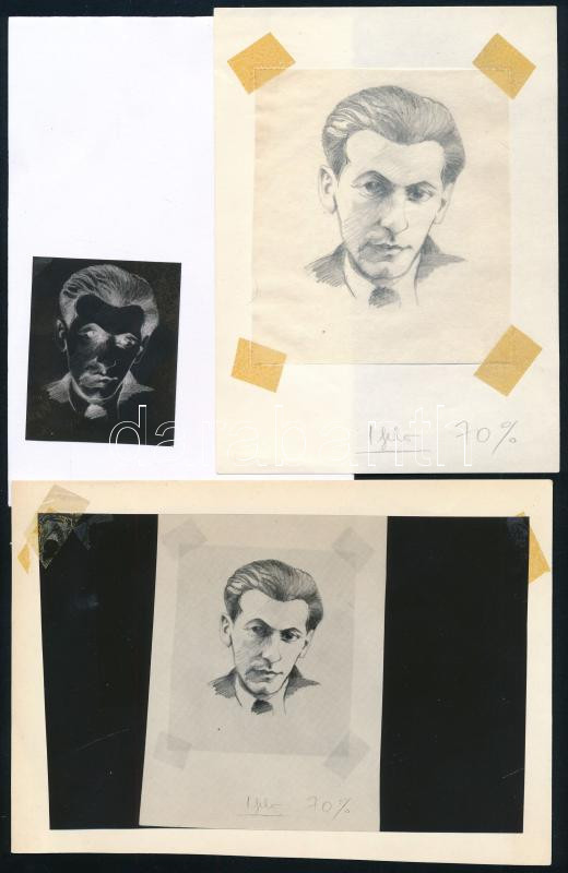 Leírás: Jelzés nélkül: Radnóti Miklós arcképe. Ceruza, pauszpapír, lapra ragasztva, 9x8 cm + a grafikáról készült felvétel fólián, 14,5x9,5 cm