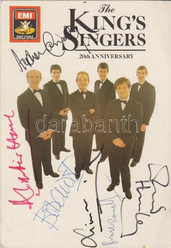 Az 1968-ban alapított The King's Singers brit a cappella együttes fotója az énekesek aláírásával. Készült 1988-ban. Színes, feliratozott lap, mérete: 150x105 mm. A felvétel az EMI Records Ltd. (a zenekar brit kiadójának) megbízásából készítette Peter Vernon. Az oxfordi King's College kórustagjainak baráti társasága az 1960-as évek közepén alapította kizárólag énekhangon alapuló zenei társulatát, melyet egykori iskolájuk iránt tisztelegve The King's Singersnek neveztek el. A kezdetektől hat énekesből álló énekkarban a mai napig változatlan a felállás, két kontratenor, egy tenor, két bariton és egy basszus szólam alkotja a zenekar egyedi, azonnal felismerhető, világszerte ünnepelt hangzását. Az alapítás óta eltelt több mint 50 évben természetesen cserélődtek a tagok, de a zenekar a mai napig a legünnepeltebb a cappella társulatnak számít, mely a legváltozatosabb zenekari, sőt könnyűzenei műveket hangszereli át saját hangzásvilágába. Aláírt fotónk az együttes fennállásának huszadik évfordulójára készült, 1988-ban: Alastair Hume (kontratenor, alapító tag), Stephen Connolly (basszus), Bob Chilcott (tenor), Simon Carrington (bariton, alapító tag), Bruce Russell (bartion), Jeremy Jackman (kontratenor) részvételével. Jeremy Jackson aláírása helyett fotónkon David Hurley aláírása szerepel, David Hurley 1990-ben lett hivatalosan tagja az együttesnek. Feliratozott, aláírt zenekari portrénk hátoldalán válogatás az együttes brit kiadója által gondozott nagylemezekből és kazettákból. Jó állapotú lap, jobb alsó sarkán enyhe gyűrődéssel.