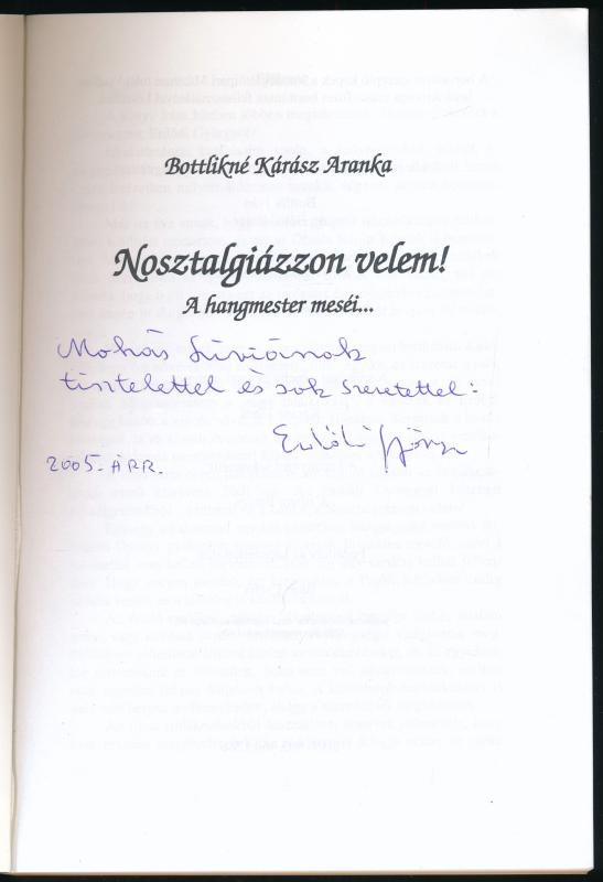 Bottilkné Kárász Aranka: Nosztalgiázzon velem! A hangmester meséi... Erdődi György karmester által Mohás Lívia (1928-2024) pszichológus, József Attila-díjas író részére DEDIKÁLT példány. Bp., 2004, Jász Nyomda és Kiadó. Kiadói papírkötés, jó állapotban.