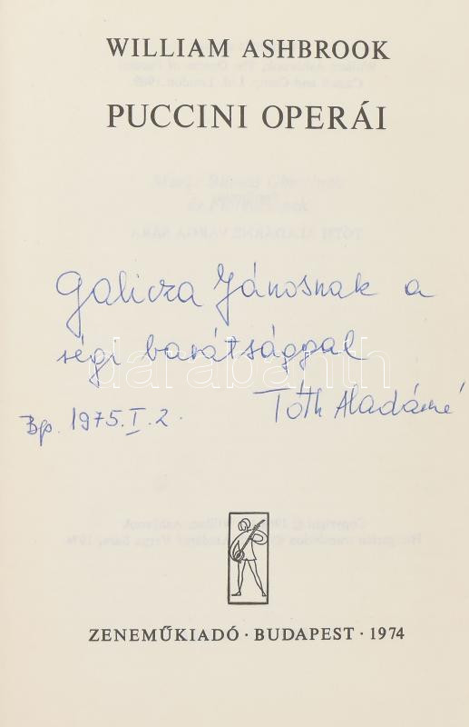 William Ashbrook: Puccini operái. Ford.: Tóth Aladárné Varga Sára. A f... https://www.darabanth.com/hu/472-Gyorsarveres/472.0/Mutargy-papirregiseg-egyeb/Zenetortenet-Kottak-Hangszerek~500011/William-Ashbrook-Puccini-operai-Ford-Toth-Aladarne-Varga-Sara-A-fordito-altal-DEDIKALT~II3163496