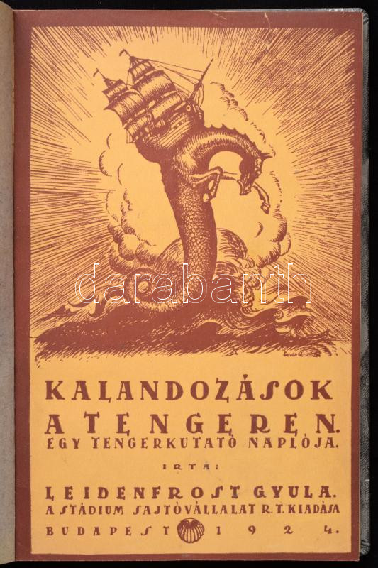 Leidenfrost Gyula: Kalandozások a tengeren. Egy tengerkutató naplója. Bp., 1924, Stádium, 269+(3) p. Szövegközti fekete-fehér illusztrációkkal. A borító Leidenfrost Sándor munkája. Átkötött egészvászon-kötésben, kissé koszos borítóval, az eredeti elülső papírborító bekötve.