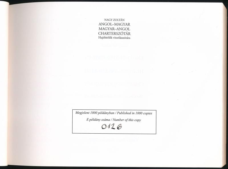 Leírás: Nagy Zoltán: Angol-Magyar - Magyar-Angol charterszótár. Hajóbérlők vitorlásszótára. Bp., 2009, szerzői. Megjelent 1000 példányban, számozott példány: 0126/1000. Kiadói papírkötésben.