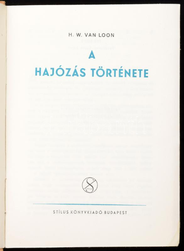 Van Loon, [Hendrik Willem]: A hajózás története. Ford.: Szerb Antal. Bp., [1941], Stílus, 285+(3) p. Szövegközti fekete-fehér illusztrációkkal. A borító Gózon Lajos munkája. Kiadói kartonált papírkötés, illusztrált kiadói papír védőborítóban, a védőborító kissé viseltes.