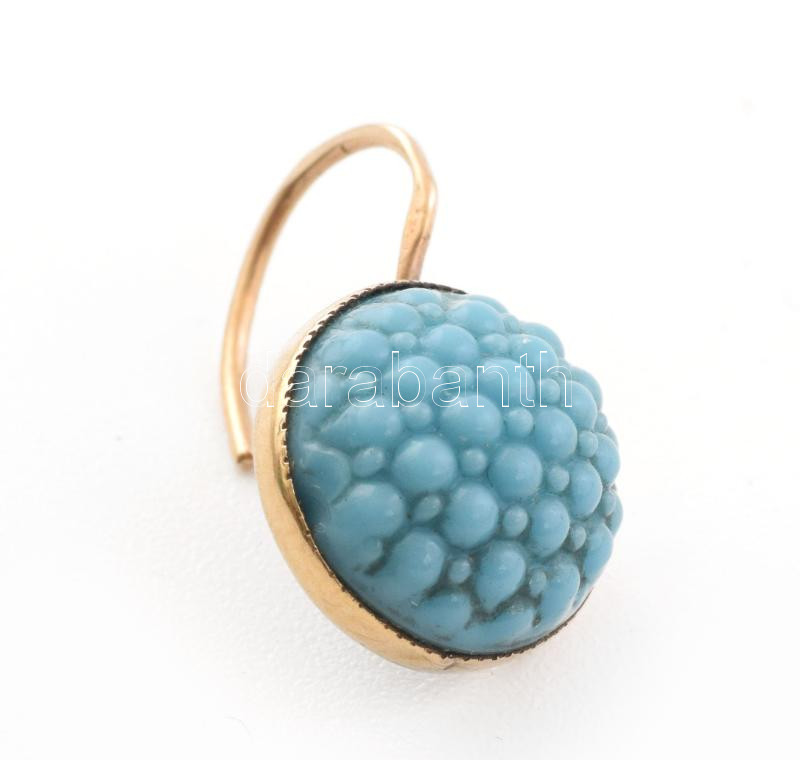 Leírás: Arany (Au) fülbevaló, hiányos, türkiz berakással, 14k, jelzett, bruttó: 2,5g