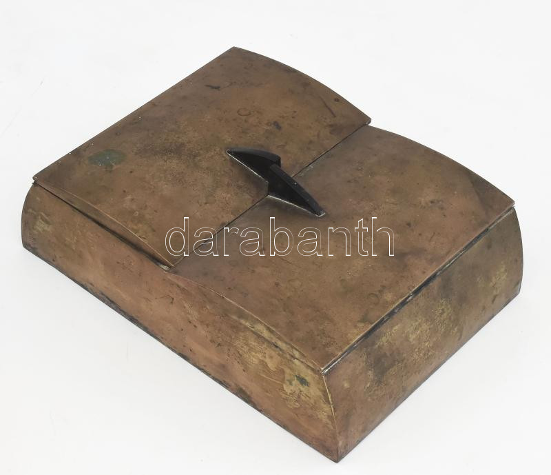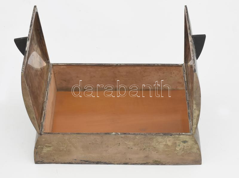 Art deco ezüst (Ag) asztali doboz, ládika. Nagy méretű, rózsafa fogóval, vékony fa betéttel. Jelzett, dianás, K. E. mesterjeggyel, br: 1140 g 25x19x9 cm