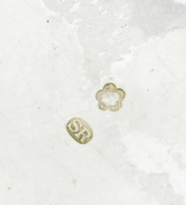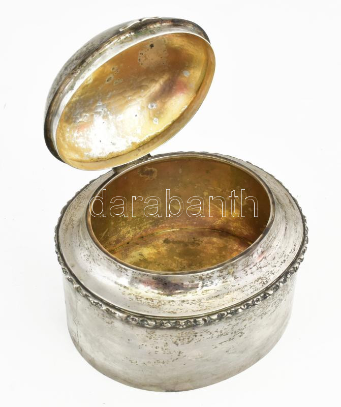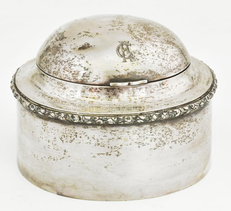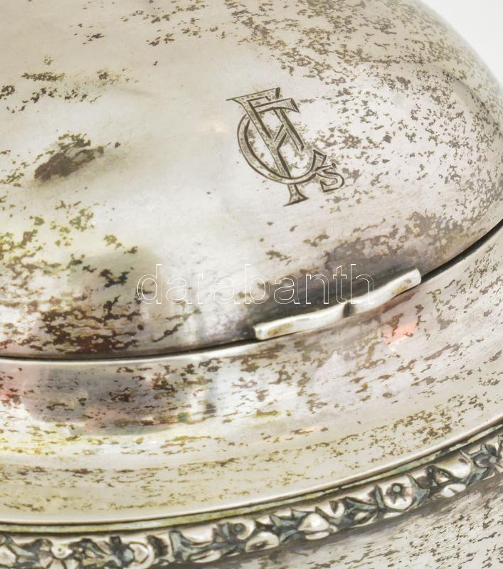 Ezüst (Ag) cukordoboz. 1937 előtti dianás fémjellel. SR (Spiró Rezső) mesterjeggyel Poncolt fedél, rózsa mintás peremmel CH monogrammal, tetején kis horpadással 449 g. 14x13x10 cm