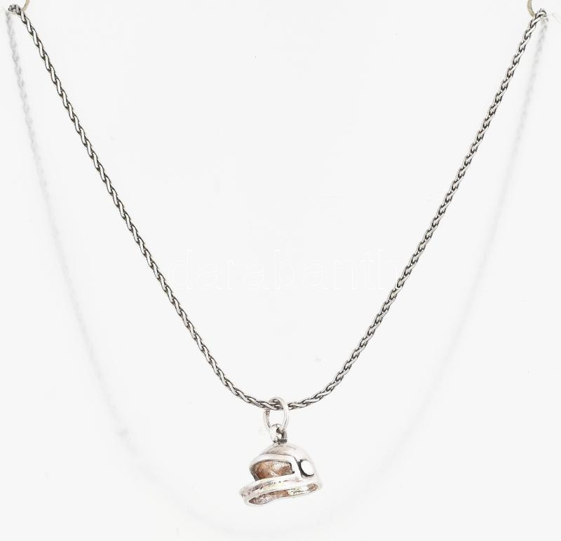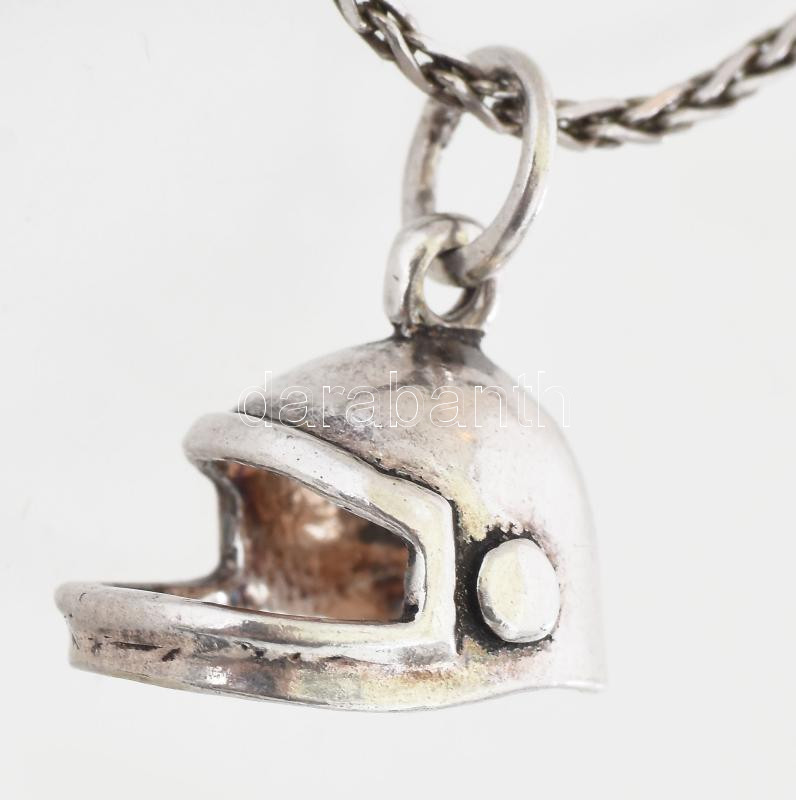 Leírás: Ezüst(Ag) fonott nyaklánc, jelzett, h: 45 cm, bukósisak medállal, 11,5×1,2 cm, nettó: 6,8 g
