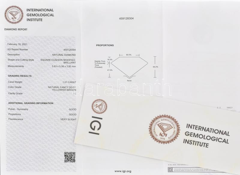 Leírás: Gyémánt 1,01 ct sárgásbarna szín módosított brilliáns csisolással I1. 5,63x5,56x3,85 mm IGI tanusítvánnyal