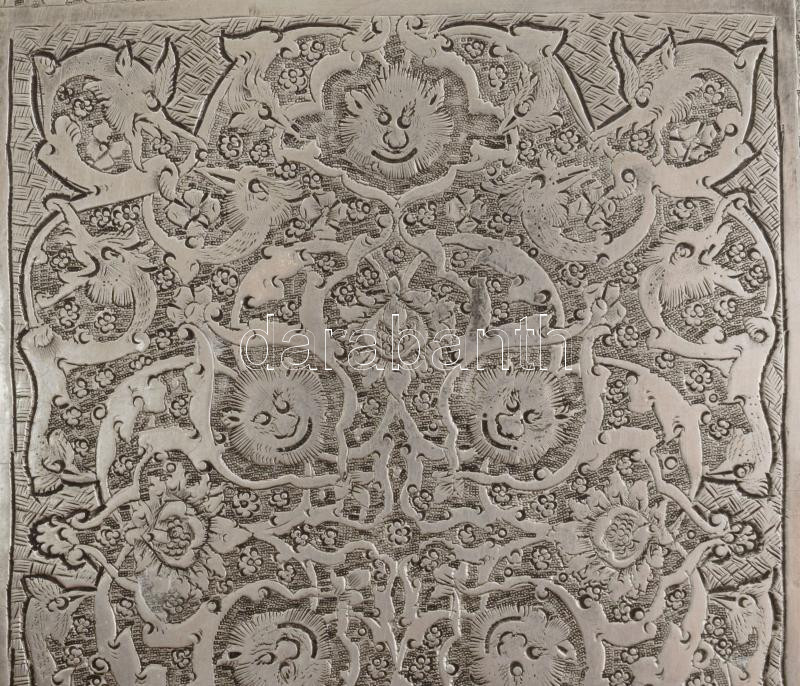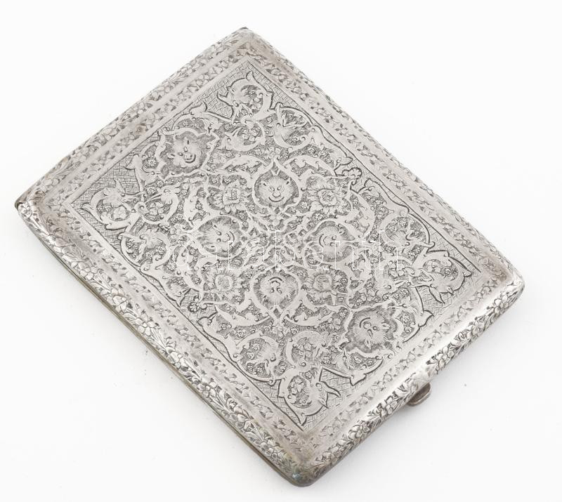 Leírás: Perzsa ezüst (Ag) cigaretta tárca, gazdag sárkány- és ördögábrázolásos díszítéssel, kis sérüléssel, 115g