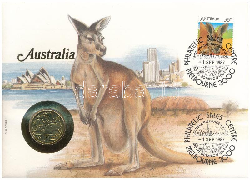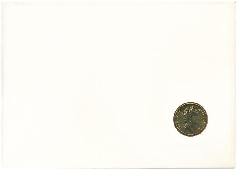 Ausztrália 1985. 1$ Al-bronz "A Dollár 10. évfordulós kiadása" érme felbélyegzett borítékban, első napi bélyegzéssel, német nyelvű tájékoztatóval T:UNC Australia 1985. 1 Dollar Al-bronze coin in envelope with stamp, first day cancellation and a prospectus in german C:UNC