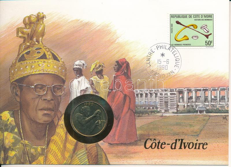Elefántcsontpart felbélyegzett borítékban, bélyegzéssel, benne Nyugat Afrikai Államok 1990. 25Fr, német nyelvű leírással T:UNC Ivory Coast in envelope with stamp and cancellation, in it West African States 1990. 25 Francs with German language description C:UNC