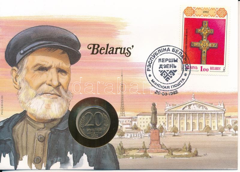 Fehéroroszország felbélyegzett borítékban, bélyegzéssel, német nyelvű tájékoztatóval, benne Oroszország 1992. 20R Cu-Ni T:AU