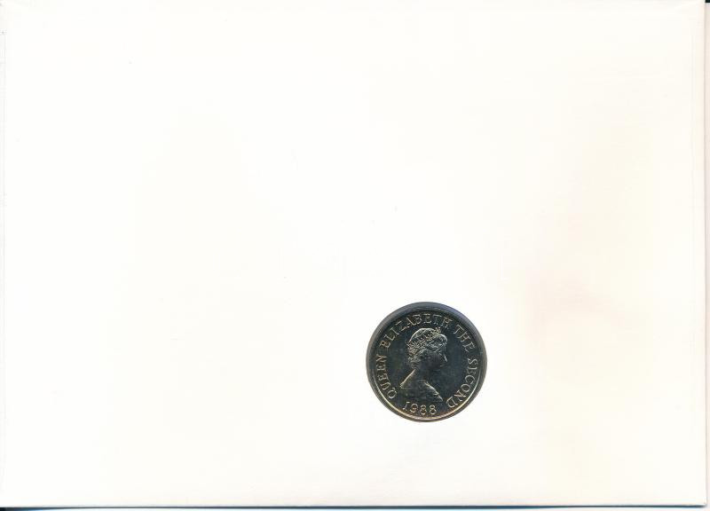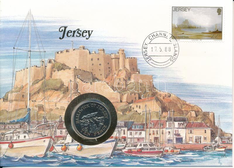 Jersey 1988. 10p Cu-Ni felbélyegzett borítékban, bélyegzéssel, német nyelvű leírással T:UNC Jersey 1988. 10 Pence Cu-Ni in envelope with stamp, with German description C:UNC