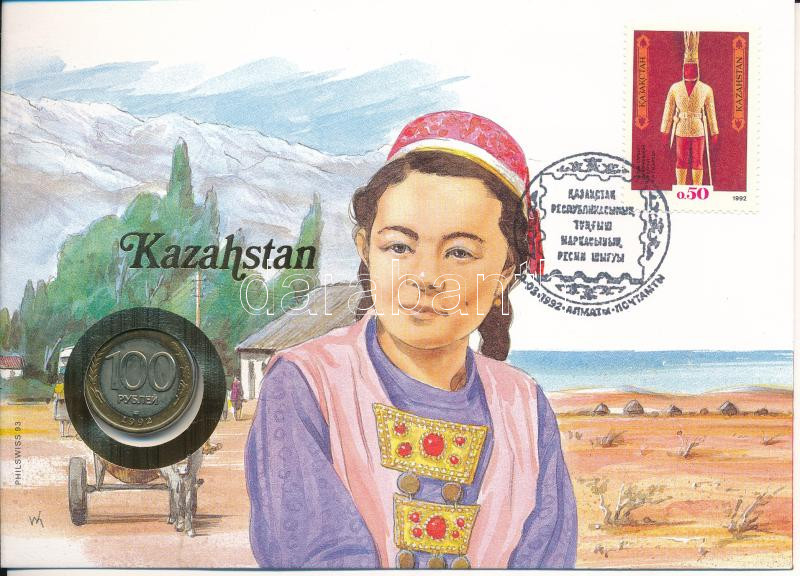 Kazahsztán felbélyegzett borítékban, bélyegzéssel, német nyelvű tájékoztatóval, benne Oroszország 1992. 100R bimetál T:AU Kazakhstan in envelope with stamp, cancellation and a prospectus in german, in it Russia 1992. 100 Rubles bimetallic C:AU