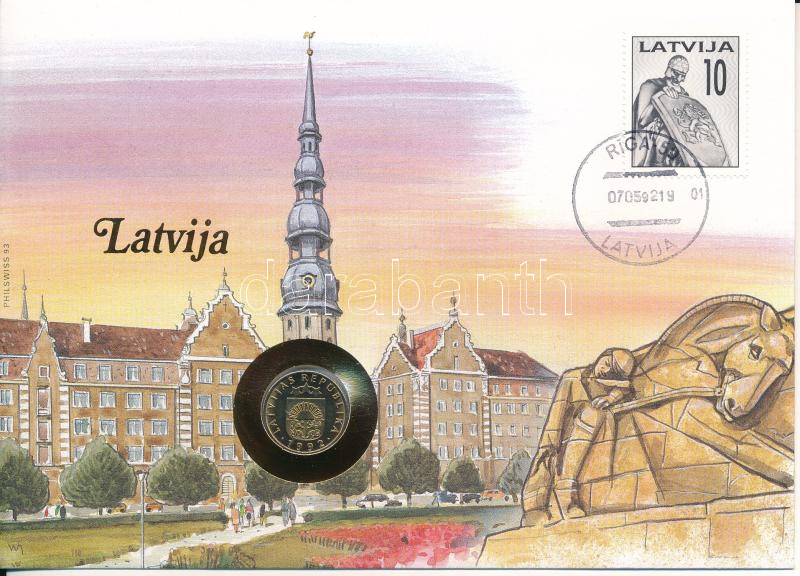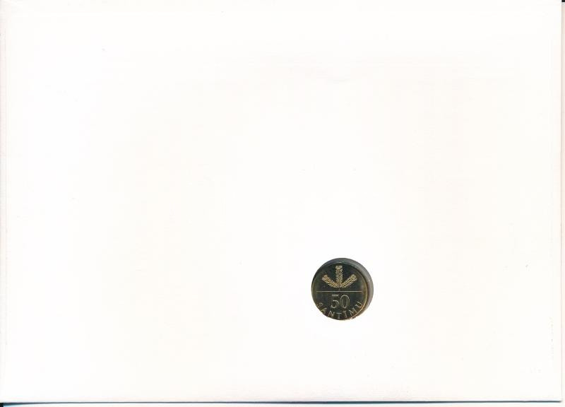 Lettország 1992. 50s Cu-Ni felbélyegzett borítékban, bélyegzéssel, német nyelvű tájékoztatóval T:AU Latvia 1992. 50 Santimu Cu-Ni in envelope with stamp, cancellation and a prospectus in german C:AU