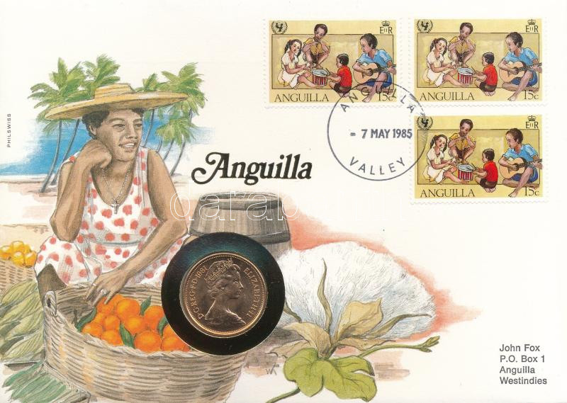 Nagy-Britannia 1981. 25p bronz "II. Erzsébet", felbélyegzett "Anguilla" borítékban, bélyegzéssel, német nyelvű leírással T:UNC Anguilla 1981. 25 Pence bronze "Elizabeth II" in "Anguilla" envelope with stamp, cancellation and prospectus in German C:UNC