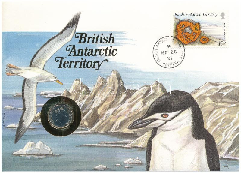 Nagy-Britannia 1990. 5p "Brit Antarktiszi Terület" érmés borítékban, bélyegzéses bélyeggel, német nyelvű leírással T:UNC