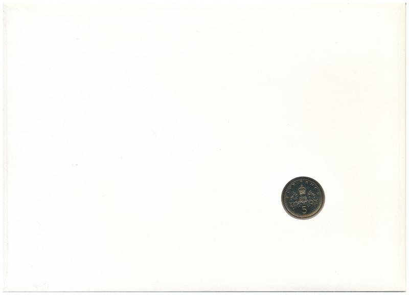 Great Britain 1990. 5 Pence in "British Antarctic Territory" coin envelope with stamp and cancellation, with German description C:UNC