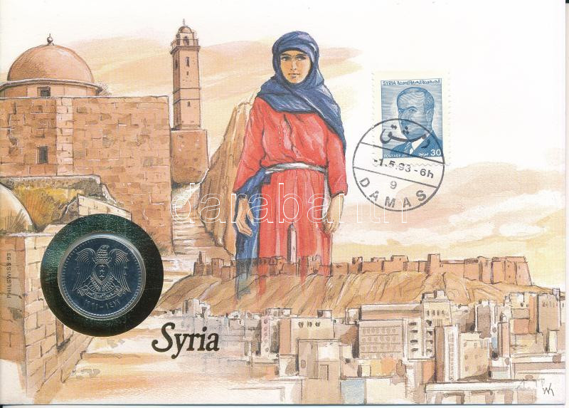 Syria 1991. 1 Pound in envelope with stamp and cancellation, with German language description C:UNC