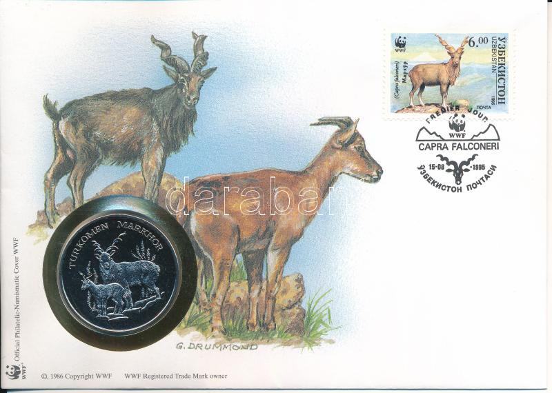 Üzbegisztán DN (1991) "A Világ Vadvédelmi Alap (WWF) 30. évfordulója - Turkomen Markhor (Pödröttszarvú kecske)" kétoldalas fém emlékérem érmés borítékban, bélyeggel és bélyegzéssel, német nyelvű ismertetővel T:PP Uzbekistan ND (1991) "30th Anniversary of the World Wildlife Fund - Turkomen Markhor" two-sided metal commemorative medallion in envelope with stamp and cancellation, with German description C:PP