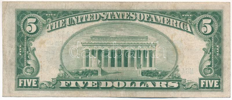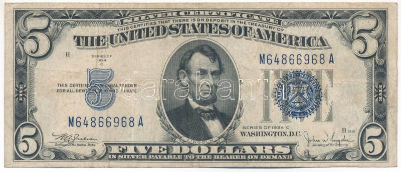 Amerikai Egyesült Államok 1946-1949. (1934C) 5$ "Silver Certificate - kisméretű" kék pecsét "William Alexander Julian, John Wesley Snyder" T:F folt USA 1946-1949. (1934C) 5 Dollars "Silver Certificate - Small size" blue seal "William Alexander Julian, John Wesley Snyder" C:F spotted Krause P#414A