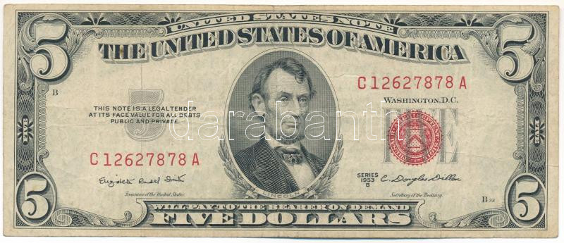 USA 1961-1962. (1953B) 5 Dollars red seal, "Elizabeth Rudel Smith - Clarence Douglas Dillon" C:F