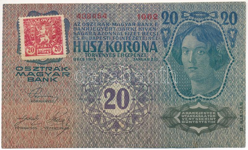 Czechoslovakia 1913. 20 Korona "1002 408464", 2nd issue, with czechoslovakian 20 Halerov stamp C:F with tear along a fold line