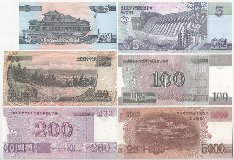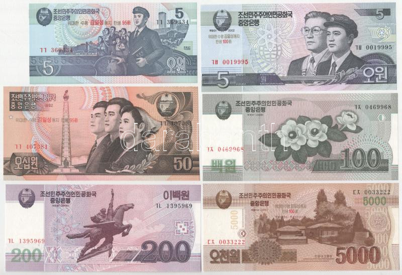 North Korea 1992-2013. 5 Won - 5000 Won (6xdiff) within overprinted pieces C:UNC,AU
