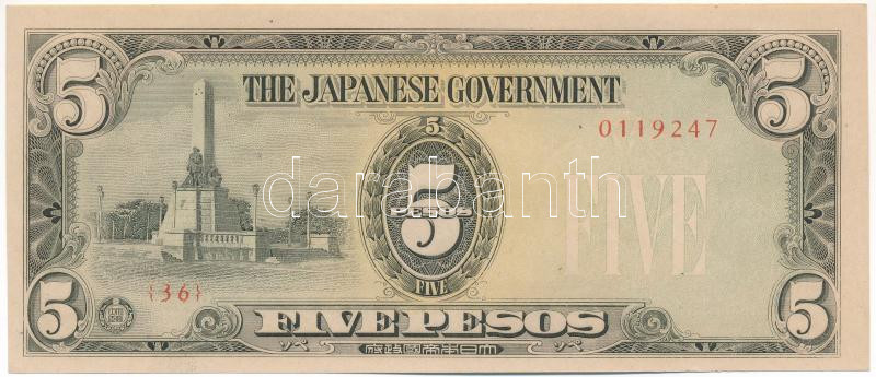 Philippines / Jap... https://www.darabanth.com/hu/472-Gyorsarveres/472.0/Numizmatika/Kulfoldi-bankjegyek~2000016/Fulop-szigetek-Japan-megszallas-DN-1943-5P-TAU-Philippines-Japanese-Occupation-ND-1943~II3192250