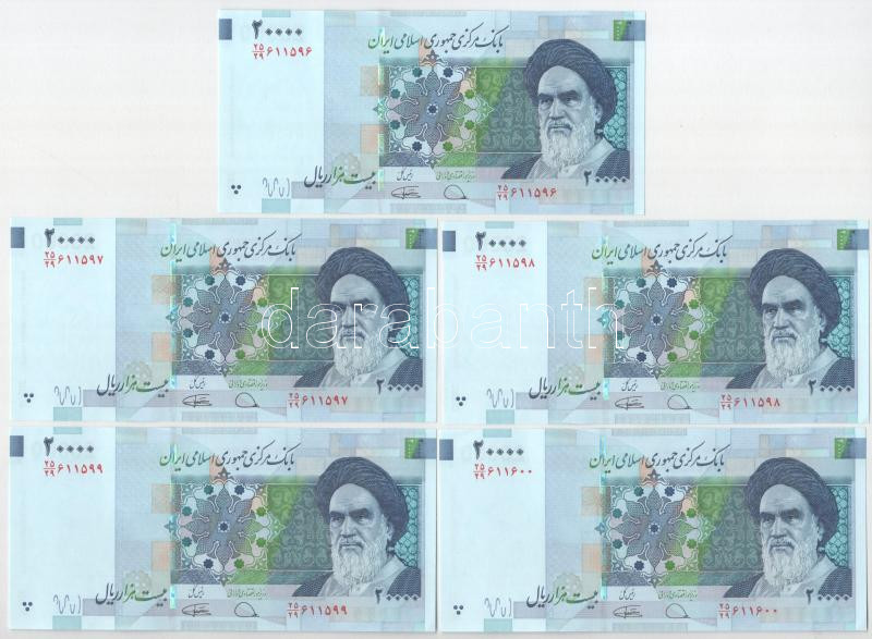 Leírás: Irán DN (2014-2021) 20.000R (5x) sorszámkövetők T:UNC Iran ND (2014-2021) 20.000 Rials (5x) consecutive serials C:UNC,AU