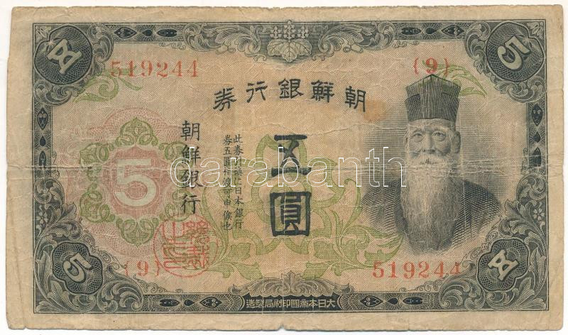 Korea / Japanese Protectora... https://www.darabanth.com/hu/472-Gyorsarveres/472.0/Numizmatika/Kulfoldi-bankjegyek~2000016/Korea-Japan-Protektoratus-1944-5Y-TVG-Korea-Japanese-Protectorate-1944-5-Yen-CVG-Krause-~II3199870